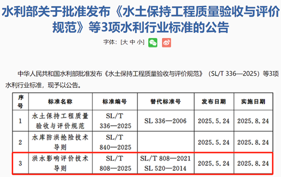 近日,公司參編水利行業標準《洪水影響評價技術導則》(SL/T 8082025)(中華人民共和國水利部公告202512號)正式發布,將于2025824日起實施。