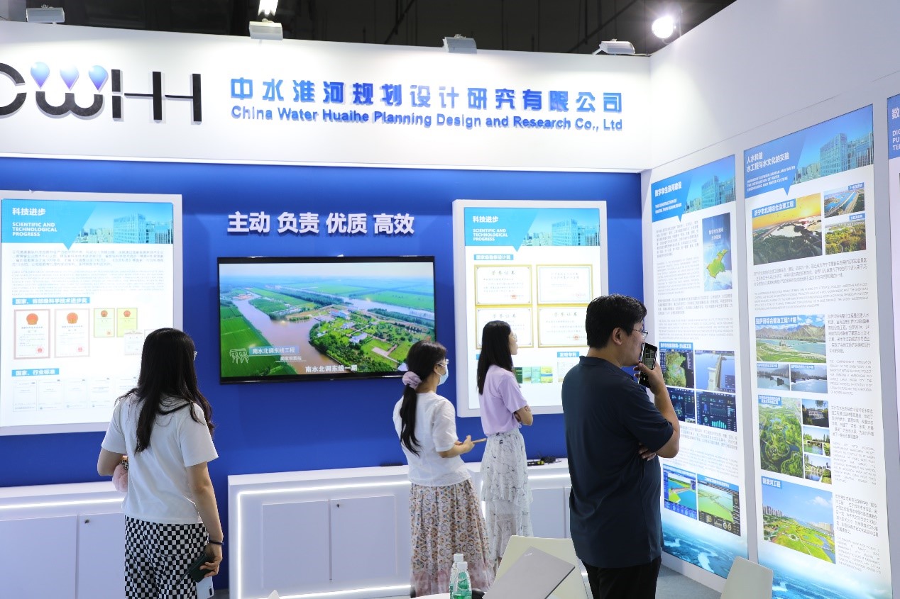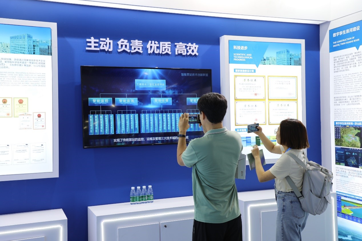 公司在A展廳設置展區,圍繞國家治淮重點工程、國家骨干水網工程、科技進步、人水和諧-水工程與水文化的交融、數字孿生淮河建設、數字孿生智能泵站技術、板橋水庫混凝土壩壩體滲漏深水水下防滲處理關鍵技術及灌注樁-粉噴樁混合式樁基技術等八大主題設置展板。