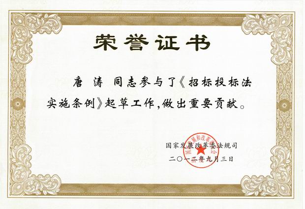 《中華人民共和國招標投標法實施條例》(以下簡稱“條例”)已于2012年2月1日起施行。近日國家發(fā)展改革委表彰了一批對《條例》起草工作做出重要貢獻的專家。唐濤總經(jīng)理作為全國水利系統(tǒng)的兩名起草專家之一受到國家發(fā)展改革委的表彰并獲榮譽證書。