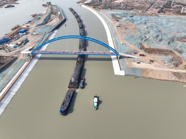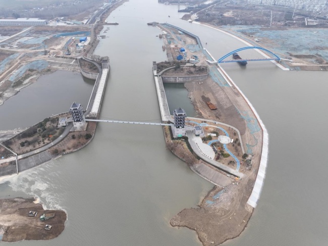 2月22日,隨著海事巡邏艇的警笛聲響起,兩艘工作船開始在淮安樞紐段運河南北側圍堰外側拉起攔河浮筒,淮河入海水道二期工程淮安樞紐導航明渠正式啟用,京杭運河改航順利完成。