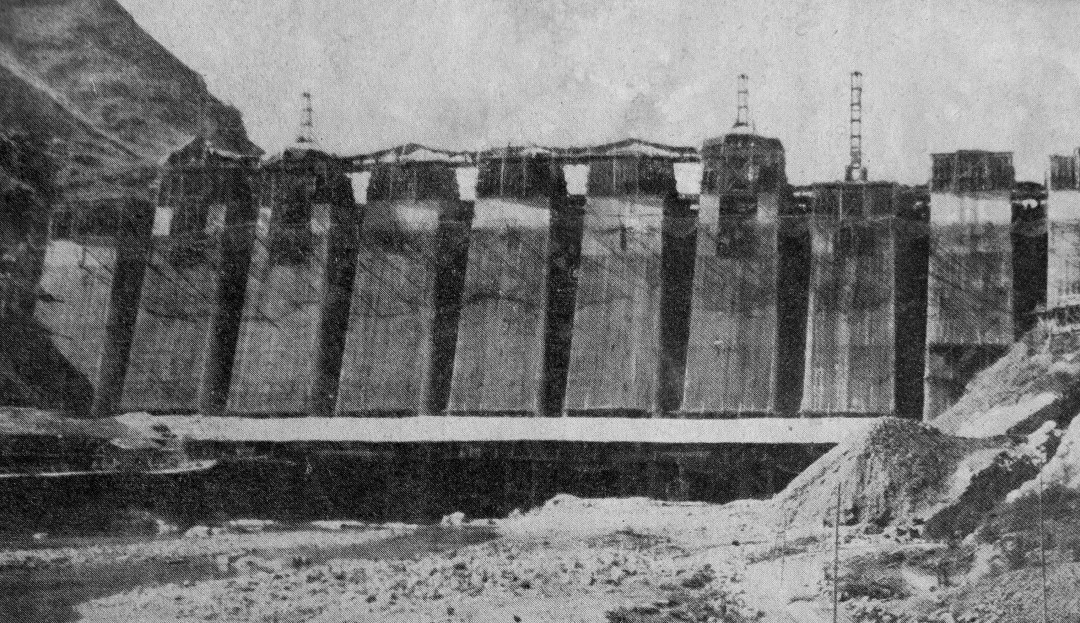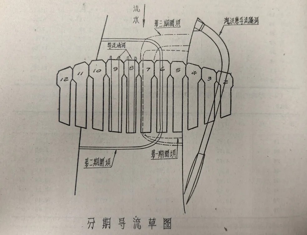 完成前期的關(guān)鍵準(zhǔn)備工作,1956年9月工程開工建設(shè),由治淮委員會勘測設(shè)計(jì)院組建磨子潭水庫工程指揮部負(fù)責(zé)施工。由于水庫位于大別山區(qū)淠河上游,地形上為峽谷,河床寬度僅有90米,且兩岸山坡陡峻,坡度在1:1至1:1.4之間,并有局部陡壁存在,因此清基爆炸數(shù)量大。按原定計(jì)劃,大壩開工前應(yīng)當(dāng)鑿?fù)ㄐ购樗矶醋鳛榇髩问┕て陂g導(dǎo)流之用,上下游做好圍壩,進(jìn)行基礎(chǔ)開挖,然后再澆筑大壩混凝土。泄洪隧洞于1956年9月中旬開挖,而大壩要求1957年汛期就要起到攔洪作用,因此磨子潭水庫施工期限十分短促。為及時(shí)完成要求,磨子潭水庫工程指揮部結(jié)合當(dāng)?shù)氐牡刭|(zhì)特點(diǎn)等,采用了分三期導(dǎo)流、分區(qū)爆炸、分區(qū)澆筑混凝土的方案,成功完成了約33萬立方米的混凝土澆筑。